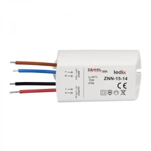 Zasilacz ZNN-15-14 to profesjonalny zasilacz impulsowy o stabilizacji napięciowej 14 V DC. Przeznaczony jest do montażu natynkowego. Znamionowa moc wyjściowa wynosi 15 W. Zasilacz rekomendowany jest do zasilania opraw oraz osprzętu należącego do grupy LEDIX. Produkt posiada zabezpieczenia przeciwzwarciowe oraz przeciążeniowe, które zwiększają bezpieczeństwo jego użytkowania. Wysoka sprawność oraz bardzo mały pobór mocy w trybie czuwania sprawiają, iż jest to rozwiązanie bardzo ekonomiczne, przeznaczone do pracy ciągłej. Zasilacz spełnia wymagania norm zharmonizowanych.