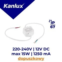 Zasilacz CV, Długość [mm]: 49, Szerokość [mm]: 50, Wysokość [mm]: 27, Typ: Zasilacze, Częstotliwość znamionowa [Hz]: 50, Długość przewodu [m]: 0.19, Klasa ochronności przed porażeniem elektrycznym: II, Kolor: biały, Maksymalna temperatura Ta [°C]: 40, Materiał: tworzywo sztuczne, Miejsce zastosowania: wewnątrz i na zewnątrz, Moc maksymalna [W]: 15, Moc znamionowa [W]: max 15, Możliwość montażu na powierzchniach normalnie palnych: tak, Możliwość współpracy ze ściemniaczem: nie, Napięcie wejściowe - PRI [V]: 220-240, Napięcie wyjściowe - SEC [V]: 12 DC, Napięcie znamionowe [V]: 220-240 AC, Prąd znamionowy [A]: max 0,4, Rodzaj przyłącza: wolne końce przewodów, Rodzaj zasilacza: stałonapięciowy, Stopień IP: 67, Przekrój przewodu [mm2]: PRI: 0,75 / SEC: 0,75, Tc [°C]: 85, Zabezpieczenie przeciążeniowe: 1, Zabezpieczenie zwarciowe: 1, Prąd wyjściowy - SEC [mA]: max 1250, λ: 0,9,