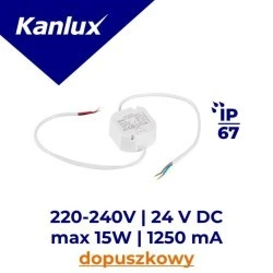 Zasilacz CV, Długość [mm]: 49, Szerokość [mm]: 50, Wysokość [mm]: 27, Typ: Zasilacze, Częstotliwość znamionowa [Hz]: 50, Długość przewodu [m]: 0.19, Klasa ochronności przed porażeniem elektrycznym: II, Kolor: biały, Maksymalna temperatura Ta [°C]: 40, Materiał: tworzywo sztuczne, Miejsce zastosowania: wewnątrz i na zewnątrz, Moc maksymalna [W]: 15, Moc znamionowa [W]: max 15, Możliwość montażu na powierzchniach normalnie palnych: tak, Możliwość współpracy ze ściemniaczem: nie, Napięcie wejściowe - PRI [V]: 220-240, Napięcie wyjściowe - SEC [V]: 24 DC, Napięcie znamionowe [V]: 220-240 AC, Prąd znamionowy [A]: max 0,4, Rodzaj przyłącza: wolne końce przewodów, Rodzaj zasilacza: stałonapięciowy, Stopień IP: 67, Przekrój przewodu [mm2]: PRI: 0,75 / SEC: 0,75, Tc [°C]: 85, Zabezpieczenie przeciążeniowe: 1, Zabezpieczenie zwarciowe: 1, Prąd wyjściowy - SEC [mA]: max 625, λ: 0,9,