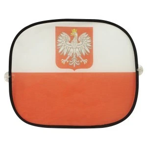 Zasłonki przeciwsłoneczne z flagą Polski i godłem umilają chwile spędzone w samochodzie. Zasłonki są mocowane do szyby za pomocą gumowych przyssawek, pasują do wszystkich modeli aut. Przyssawki dokładnie i mocno przylegają do szyby, uniemożliwiając przypadkowe odczepienie zasłonki. Zasłonki przeciwsłoneczne osłaniają przed silnymi promieniami słonecznymi.