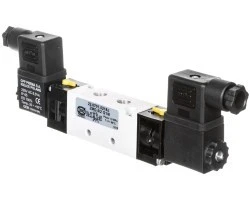 Zawory rozdzielające służą do sterowania elementami wykonawczymi np. siłownikami o ruchu liniowym lub wahadłowym w pneumatycznych układach napędowych i sterujących. Stosowane są do zmiany kierunku przepływu czynnika roboczego w przewodach pneumatycznych lub do odcinania przepływu. Zawory ZMG z dwoma cewkami. Gwint przyłącza: G1/8. Funkcja zaworu 5/2. Rodzaj prądu zasilającego elektromagnes : zmienny. Napięcie prądu zasilającego elektromagnes: 240 V. Zakres ciśnień pracy: 0,15-1,0 MPa. Zakres temperatur pracy: od 0° do + 65°C. Rodzaj konstrukcji: suwakowy. Sposób zasilania: przewodowo lub płytowo (wyspa zaworowa) sprężonym powietrzem o maksymalnej wielkości cząstek stałych 40µm, smarowanym mgłą olejową: 2-5 kropli/m?. Względny czas sterowania elektromagnesem : 100%. Stopień zabezpieczenia elektrycznego: IP65.