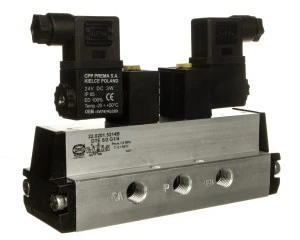 Zawory rozdzielające służą do sterowania elementami wykonawczymi (np. siłownikami o ruchu liniowym lub wahadłowym) w pneumatycznych układach napędowych i sterujących poprzez zmianę przepływu czynnika roboczego. Zawory DTE z zaworem wspomagającym typu EVM. Gwint przyłącza: G1/4. Funkcja zaworu 5/2. Rodzaj prądu zasilającego elektromagnes : stały. Napięcie prądu zasilającego elektromagnes: 24 V. Zakres ciśnień pracy: 0,2-1,0 MPa. Zakres temperatur pracy: od 0° do + 65°C. Rodzaj konstrukcji: suwakowy. Sposób zasilania: przewodowy.
