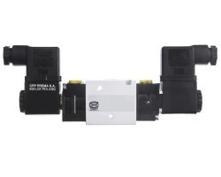 Zawory rozdzielające służą do sterowania elementami wykonawczymi np. siłownikami o ruchu liniowym lub wahadłowym w pneumatycznych układach napędowych i sterujących. Stosowane są do zmiany kierunku przepływu czynnika roboczego w przewodach pneumatycznych lub do odcinania przepływu. Zawory ZMG z dwoma cewkami. Gwint przyłącza: G1/4. Funkcja zaworu 3/2. Rodzaj prądu zasilającego elektromagnes : stały. Napięcie prądu zasilającego elektromagnes: 24 V. Zakres ciśnień pracy: 0,15-1,0 MPa. Zakres temperatur pracy: od 0° do + 65°C. Rodzaj konstrukcji: suwakowy. Sposób zasilania: przewodowo lub płytowo (wyspa zaworowa) sprężonym powietrzem o maksymalnej wielkości cząstek stałych 40µm, smarowanym mgłą olejową: 2-5 kropli/m?. Względny czas sterowania elektromagnesem : 100%. Stopień zabezpieczenia elektrycznego: IP65.