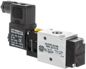 Zawory rozdzielające służą do sterowania elementami wykonawczymi np. siłownikami o ruchu liniowym lub wahadłowym w pneumatycznych układach napędowych i sterujących. Stosowane są do zmiany kierunku przepływu czynnika roboczego w przewodach pneumatycznych lub do odcinania przepływu. Zawory ZMG z jedną cewką. Gwint przyłącza: G1/4. Funkcja zaworu 3/2. Rodzaj prądu zasilającego elektromagnes : stały. Napięcie prądu zasilającego elektromagnes: 24 V. Zakres ciśnień pracy: 0,3-1,0 MPa. Zakres temperatur pracy: od 0° do + 65°C. Rodzaj konstrukcji: suwakowy. Sposób zasilania: przewodowo lub płytowo (wyspa zaworowa) sprężonym powietrzem o maksymalnej wielkości cząstek stałych 40µm, smarowanym mgłą olejową: 2-5 kropli/m?. Względny czas sterowania elektromagnesem : 100%. Stopień zabezpieczenia elektrycznego: IP65.