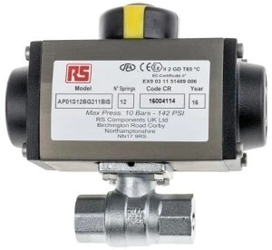 Mosiężny zawór kulowy z siłownikiem pneumatycznym. 40 bar, o udźwigu znamionowym Dwustronne działanie Mosiądz prasowany na gorąco Pokrywka końcowa wciśnięta na gorąco mosiądz Chromowane mosorami Miejsce na pierścień P.T.F.E. Uszczelnienie nadwozia: P.T.F.E. Mosiądz łodyg Pierścień szyjkowy Witon O-ring NBR 70