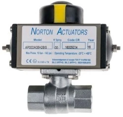 Mosiężny zawór kulowy z siłownikiem pneumatycznym. 40 bar, o udźwigu znamionowym Dwustronne działanie Mosiądz prasowany na gorąco Pokrywka końcowa wciśnięta na gorąco mosiądz Chromowane mosorami Miejsce na pierścień P.T.F.E. Uszczelnienie nadwozia: P.T.F.E. Mosiądz łodyg Pierścień szyjkowy Witon O-ring NBR 70