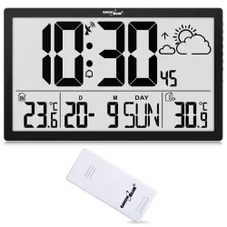 Na dużym, czytelnym wyświetlaczu oprócz bieżącej godziny wyświetlana jest również data, dzień tygodnia, temperatura wewnętrzna i zewnętrzna (bezprzewodowy czujnik w zestawie) oraz graficzna prognoza pogody.