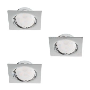 Zestaw 3 sztuk oczek składający się z: pierścieni dekoracyjnych (regulacja kątowa 50 stopni; materiał:stal; IP20; kolor: chrom; kształt: kwadratowy), źródeł światła (TOMIv2 GU10; 4,9W; 3000K; 400lm) i oprawek ceramicznych ze wspornikiem.