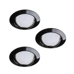 Zestaw 3 sztuk oczek składający się z: pierścieni dekoracyjnych (regulacja kątowa 50 stopni; materiał:stal; IP20; kolor: czarny; kształt: okrągły), źródeł światła (TOMIv2 GU10; 4,9W; 3000K; 400lm) i oprawek ceramicznych ze wspornikiem.