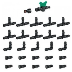 Zestaw akcesoriów do linii kroplującej o średnicy 16 mm składa się z 27 elementów, które są niezwykle przydatne w budowie efektywnego systemu nawadniania. Obejmuje on różnorodne komponenty, które umożliwiają łatwe podłączenie, kontrolę przepływu wody oraz tworzenie rozbudowanych układów podlewania.