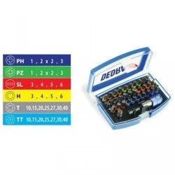 Zestaw 32 szt końcówek wkrętakowych. W skład zestawu wchodzą Końcówki PH, PZ, SL, H, T oraz TT. Końcówki wykonane zostały ze stali S2, która cechuje się wysoką hartownością oraz odpornością na uderzenia. Dzięki odpowiedniemu składowi chemicznemu i obróbce cieplnej, końcówki na długo zachowują swoje wysokie właściwości wytrzymałościowe.
