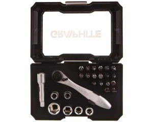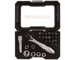 Zestaw podstawowych końcówek i nasadek GRAPHITE (nr. ref 56H604), idealny do drobnych prac montażowych. Grzechotka pozwala na solidne i szybkie skręcanie lub rozkręcanie elementów. Zestaw kocówek wkrętakowych i nasadek, 26 szt., końcówki 25 mm - 18 szt., nasadki 1/4'' - 5 szt., adapter 1/4'' - 1 szt., przedłużka 1/4'' - 1 szt., grzechotka 1/4'' - 1 szt.