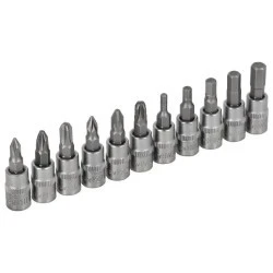 Uniwersalny zestaw bitów na nasadkach 1/4 cala powinien stać się podstawą wyposażenia warsztatów narzędziowych. Zawiera końcówki nasadkowe, które pasują do kluczy i grzechotek o trzpieniach ćwierćcalowych. Część robocza bitów jest dostosowana do obsługi wkrętów i śrub z gniazdem w górnej części łba. Końcówki są przeznaczone do operowania przy wkrętach krzyżakowych i TORX. Zestaw bitów na nasadkach STALCO zawiera 11 różnych końcówek. Wszystkie są wykonane ze stali chromowo-wanadowej. Zapewnia im to dużą odporność na ścieranie, dlatego bity będą pasowały do gniazd pomimo intensywnej i długotrwałej pracy. Dla łatwiejszego przechowywania i przenoszenia bity umieszczone są na mocnej listwie z tworzywa sztucznego.