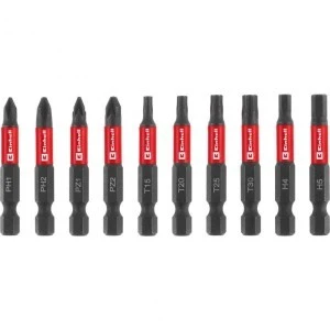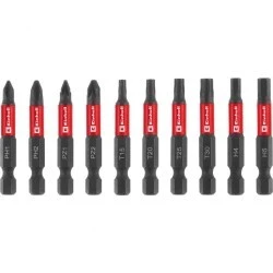 10-częściowy zestaw bitów udarowych Einhell w rozmiarze kieszonkowym z karabińczykiem zawiera 50-milimetrowe bity udarowe z profilami PH1 / PH2 / PZ1 / PZ2 / T15 / T20 / T25 / T30 / H4 / H5. Wykonane są ze stali manganowo-fosforanowej S2, która charakteryzuje się ponadprzeciętną twardością, co czyni je wyjątkowo odpornymi na zużycie i trwałymi. Wszystkie bity mają oznaczenie profilu oraz logo Einhell na czerwonym pierścieniu.