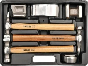 Zestaw podstawowych narzędzi blacharskich. Trzy młotki o różnych profilach obuchów, osadzone na trzonkach z drewna hikorowego ,cztery kształtki stalowe służące do profilowania blachy . Odkuwane na zimno, szlifowane i polerowane. Zestaw w walizce z tworzywa. Do ręcznego kształtowania blach , przy pracach warsztatowych w motoryzacji lub w pracach dekarskich.