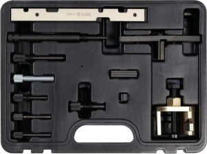 Zestaw zawiera: blokadę wałka rozrządu, blokady pompy wtryskowej, blokady koła zamachowego, ściągacz koła zębatego oraz śruby blokujące.