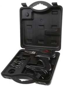 SP-100: Pistolet na ciepło natychmiastowe, 2 zapasowe końcówki pistoletu, futerał. Zestaw lutowniczy RS. Zestaw 5-elementowy umożliwiający szybkie lutowanie. Termoizolacyjny pistolet lutowniczy o mocy 100 W Wskazówka osiąga pełną temperaturę roboczą w sekundach Lekki, wyważony uchwyt pistoletowy Plastikowa obudowa odporna na uderzenia w 100% Wbudowane światło robocze z lutowaniem Wtyczka BP do zasilania sieciowego 230 V.