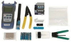 Patyczki higieniczne, Chusteczki bezpyłowe, Miernik mocy optycznej, Praktyczna torba umożliwiająca wygodne i bezpieczne przechowywanie oraz przenoszenie narzędzi, Pojemnik na alkohol izopropylowy z praktycznym dozownikiem, Nóż do włókien światłowodowych, Uniwersalny stripper do włókien, Stripper do płaskich kabli światłowodowych, Laserowy tester światłowodów , |