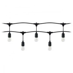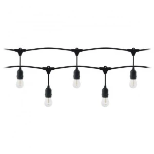 Dekoracyjny i praktyczny zestaw oświetleniowy w wersji 5 m. W zestawie girlandy oświetleniowej znajdziesz: sznur wyposażony w oprawy przystosowane do żarówek E27 oraz adekwatne żarówki, emitujące strumień światła o mocy 80 lm. Zapasowa sztuka pozwoli cieszyć się efektowną dekoracją bez niespodzianek. Zestaw oświetleniowy pozwoli stworzyć przytulny nastrój w pokoju, na balkonie, tarasie lub - dzięki wysokiej (IP44) klasie szczelności - w ogrodzie. Temperatura barwowa na poziomie 3000K daje miękkie i ciepłe światło, o kojących i relaksacyjnych właściwościach. Zestaw dobrze sprawdzi się jako element wystroju wszędzie tam, gdzie zależy nam na osiągnięciu efektu przytulności i komfortu. Girlandy świetlne można z sobą łączyć, uzyskując niemal nieograniczone możliwości pracy oświetleniem, nawet na dużych powierzchniach. Nad każdą oprawą umieszczony jest specjalny uchwyt montażowy, który pozwala na precyzyjne rozmieszczenie punktów świetlnych w wybranych miejscach. Możliwe jest też podwieszenie sznura na odpowiedniej wysokości i w strategicznie rozmieszczonych punktach, co zapewni nam również trwałość tworzonej dekoracji. W tym zestawie punkty świetlne (5 opraw) rozmieszczone są w odległościach co 90cm. Kolor girlandy: czarny.