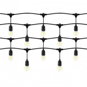 Zestaw zawiera 1 sznur girlandy o długości 20m oraz 20 sztuk żarówki LED o mocy 1W. Girlanda oświetleniowa posiada wysoką klasę szczelności (IP44) i może być stosowana zarówno jako dekoracyjne oświetlenie wewnątrz i na zewnątrz. To doskonały produkt do montażu na tarasach, balkonach czy w altanach. Girlandy można łączyć ze sobą i tworzyć długie linie świetlne, co jest szczególnie pomocne, jeśli sznury girlandy mają zapewnić klimatyczne oświetlenie na dużych powierzchniach lub, jeśli chcemy rozwiesić je na przykład między drzewami, przy ograniczonej ilości źródeł zasilania. Nad każdą żarówką znajduje się uchwyt montażowy, który umożliwia podwieszenie sznura w dodatkowych miejscach. Takie rozwiązanie sprawia, że girlanda nie będzie zrywać się przy mocniejszych podmuchach wiatru. Ten model produktu zawiera 20 oprawek na żarówki z gwintem E27. Oprawki rozmieszczone są w odległości 90 cm od siebie. Do zestawu dołączone są żarówki LED typu filament, które emitują światło w przyjemnej, ciepłej barwie 3000K i strumieniu świetlnym 80 lm. Zastosowanie wymiennych źródeł światła sprawia, że produkt może nam służyć przez lata.