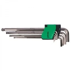 Zestaw kluczy imbusowych ze stali chromowo-wanadowej, hartowane na całej długości, niklowane, super długie, metryczne lub AF, z głowicą kulkową, w odchylanym uchwycie.