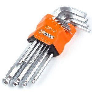 Zestaw kluczy imbusowych Polax w kształcie litery L z końcówkami kulistymi i przedłużonymi rękojeściami (25-010) to niezawodne narzędzie, idealne do rozwiązywania różnorodnych zadań podczas pracy ze śrubami wyposażonymi w wewnętrzne gniazdo sześciokątne. Zestaw zawiera 9 kluczy o różnych rozmiarach od 1,5 mm do 10 mm. Każdy klucz w zestawie wykonany jest z wysokiej jakości stali Cr-V, która zapewnia wytrzymałość i długą żywotność. Unikalną cechą tych kluczy są jednostronne końcówki kulowe, które umożliwiają pracę pod kątem do 30°, ułatwiając dostęp do trudno dostępnych miejsc. Przedłużone rękojeści klucza zapewniają dodatkowy komfort podczas pracy ze śrubami i nakrętkami. Każdy klucz ma długość od 65 mm do 160 mm, dzięki czemu ten zestaw idealnie nadaje się do różnych zastosowań. Zestaw kluczy imbusowych Polax w kształcie litery L z końcówkami kulistymi i przedłużonymi rękojeściami (25-010) przeznaczony jest do napraw, montażu i konserwacji w różnych dziedzinach. Niezależnie od tego, czy pracujesz w branży motoryzacyjnej, budownictwie czy w domu, ten kompaktowy zestaw zapewnia precyzyjne i niezawodne działanie elementów złącznych, dzięki czemu Twoja praca jest bardziej wydajna. Wygodne plastikowe opakowanie z przegródkami na każdy klucz ułatwia ich przechowywanie i organizację.