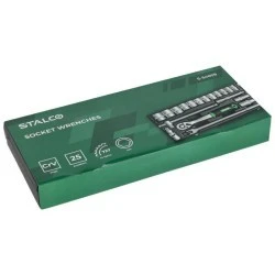 Zestaw kluczy nasadowych 3/4 cala to komplet narzędzi potrzebnych do obsługi połączeń gwintowanych. Warto zastosować go przy pracach mechanicznych i budowlanych. Przydaje się szczególnie do operowania śrubami o dużych wymiarach. Zestaw kluczy nasadowych STALCO zawiera grzechotkę z mechanizmem zaopatrzonym w 24 zęby i ergonomicznym uchwytem. W skład kompletu wchodzą nasadki w wymiarach od 19 do 50 mm i kilka dodatkowych akcesoriów do obsługi połączeń. Wszystkie elementy są wykonane z trwałego gatunku stali CrV odpornej na uszkodzenia mechaniczne, zarysowanie i korozję. Komplet akcesoriów jest zamknięty w opakowaniu z tworzywa sztucznego, co ułatwia utrzymanie narzędzi w porządku, przechowywanie i przenoszenie.