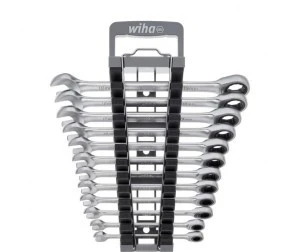 Zestaw obejmuje 12 najczęściej używanych rozmiarów, od 8 do 19 mm, umieszczonych w praktycznym uchwycie.