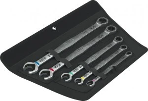 5-częściowy zestaw kluczy płasko-oczkowych z grzechotką. Unikalna kombinacja klucza płaskiego i oczkowego z mechanizmem zapadkowym w długiej wersji. Do śrub z łbem sześciokątnym i nakrętek sześciokątnych. Długa dźwignia umożliwia przenoszenie większej siły. Długa konstrukcja zapewnia również lepszy dostęp do głęboko położonych połączeń śrubowych. Z funkcją przytrzymywania dzięki metalowej płytce w szczęce, która zmniejsza ryzyko zgubienia nakrętek i śrub. Bardzo twarde ząbki wymiennej metalowej płytki pewnie chwytają śruby i nakrętki i zmniejszają ryzyko ześlizgnięcia. Wbudowany ogranicznik zapobiega ześlizgiwaniu się klucza z łba śruby i umożliwia przenoszenie wysokich momentów obrotowych. Podwójny profil sześciokątny zapewnia doskonałe połączenie kształtowe między kluczem a śrubą czy nakrętką, zmniejszając tym samym ryzyko ześlizgiwania. Kąt pracy wynoszący zaledwie 30° eliminuje czasochłonne obracanie klucza. Drobnozębny mechanizm zapadkowy z 80 zębami zapewnia maksymalną elastyczność nawet w wąskich przestrzeniach. Przenoszenie wysokich momentów obrotowych i większa wytrzymałość na zginanie dzięki specjalnej geometrii. Wykonany z wysokowydajnej stali chromowo-molibdenowej z powłoką chromowo-niklową zabezpieczającą przed korozją. System wyszukiwania narzędzi Wera "Take it easy": z oznaczeniem kolorystycznym według rozmiaru i dodatkowo naniesionymi laserowo informacjami dotyczącymi rozmiaru. W wytrzymałym składanym etui ułatwiającym transport i przechowywanie.