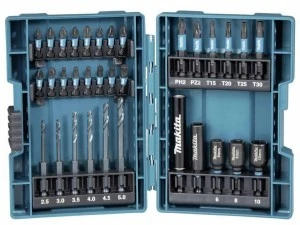 Zestaw bitów Makita B-66896 to zestaw końcówek wkręcających, składający się z 31 elementów, umożliwiający wiercenie oraz wkręcanie wkrętów oraz śrub metrycznych. Szesnaście bitów 25 mm, sześć końcówek o długości 50 mm, trzy nasadki magnetyczne HEX o długości 50 mm oraz dwa uchwyty magnetyczne o długościach 60 i 80 milimetrów umożliwią szeroką gamę prac konstruktorskich oraz napraw. Całość zapakowana w estetyczną kasetę z tworzywa sztucznego.
