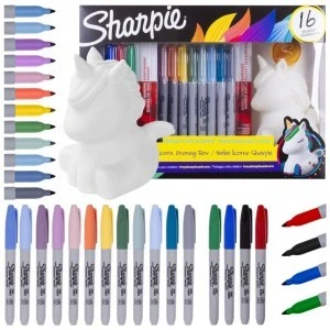Zestaw artystyczny składający się z 16 sztuk markerów permanentnych w pięknych i wyrazistych kolorach oraz niepowtarzalnej skarbonki w kształcie jednorożca. Markery permanentne Sharpie inspirują, by przekształcić zwyczajne powierzchnie w tworzone z pasją twórcze kompozycje. Stworzone, by pisać praktycznie po wszystkim, pozwolą zapomnieć o nudzie. Pisaki zawierają ikoniczny tusz, który szybko schnie i jest odporny na wodę oraz blaknięcie. Zostały wyposażone w precyzyjną końcówkę o grubość 1.00 mm.