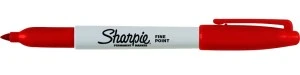 Zestaw 12 czerwonych markerów Sharpie Fine przeznaczonych do trwałego znakowania powierzchni technicznych; typ końcówki Fine umożliwia precyzyjne opisy przewodów, tablic rozdzielczych i komponentów w instalacjach elektrycznych.