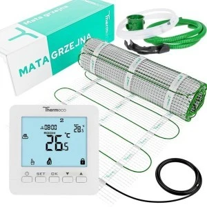 Profesjonalny zestaw ogrzewania podłogowego Thermeco został zaprojektowany z myślą o trwałości, niezawodności i prostym montażu. W skład systemu wchodzi mata grzewcza jednostronnie zasilana o mocy 150 W/m² oraz programowalny regulator temperatury Thermeco H8 z dwoma czujnikami – powietrznym i podłogowym. Zestaw przeznaczony jest do instalacji pod płytkami ceramicznymi, gresem, kamieniem naturalnym oraz w wylewkach betonowych.
