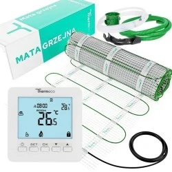 Profesjonalny zestaw ogrzewania podłogowego Thermeco został zaprojektowany z myślą o trwałości, niezawodności i prostym montażu. W skład systemu wchodzi mata grzewcza jednostronnie zasilana o mocy 150 W/m² oraz programowalny regulator temperatury Thermeco H8 z dwoma czujnikami – powietrznym i podłogowym. Zestaw przeznaczony jest do instalacji pod płytkami ceramicznymi, gresem, kamieniem naturalnym oraz w wylewkach betonowych.