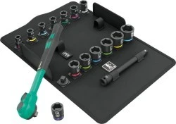 1 grzechotka 3/8" Zyklop Comfort z przełącznikiem zmiany kierunku pracy, 14 kluczy nasadowych Zyklop Impaktor, 1 przedłużka Zyklop