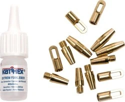 Zestaw naprawczy do taśmy złożony z 5 tulejek końcowych, 5 głowic prowadzących z oczkiem zaczepowym ∅ 6 mm, 3 tulejek łączących, specjalnego kleju 3 g i instrukcji obsługi.