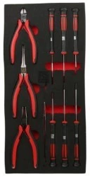 10-elementowe kombinerki precyzyjne i moduł narzędzi do sterowników ekranu RS PRO. Profesjonalny, wysokiej jakości precyzyjny szczypce RS PRO oraz zestaw sterowników przechowywany w module narzędzi z pianką EVA, który można stosować w wyborze modułu RS obudów narzędzi rolkowych i skrzyń narzędzi. Wybrane narzędzia zostały wybrane, aby mieć pewność, że masz pod ręką szeroki zakres. RS PRO oferuje szeroką gamę wysokiej jakości zestawów narzędzi i narzędzi w przystępnej cenie, aby spełnić wszystkie wymagania. Aby wyświetlić wybór szafek, kliknij łącze RS PRO cabines brourbans. Charakterystyka i zalety:. Sosferowane końcówki kierowcy do ochrony przed korozją, większą wytrzymałością i dłuższą żywotnością narzędzia Jasne, czerwone schowki ułatwiają odróżnienie małych części i mocowań Pojemniki na narzędzia - moduły piankowe są zaprojektowane do regularnego usuwania z szuflad. Zawartość zestawu. Informacje o zastosowaniu produktu Ten wybór precyzyjnych szczypiec i wkrętaków został specjalnie zaprojektowany do pracy z delikatnymi przedmiotami. Zawiera on przydatne narzędzia, które idealnie nadają się do zastosowań konserwacyjnych i naprawczych, hobbystów i DIY. Idealny do skomplikowanych zastosowań, takich jak małe układy elektroniczne. Co otrzymasz? Zawartość zestawu Szczypce i szczypce Kombinerki z krótkimi igłami 120 mm Szczypce igłowe o długości 140 mm Wycięcia głowicy odśrodkowej 110 mm Wkrętaki Szczelinowy precyzyjny śrubokręt 1,5 x 60, 2 x 60, 2,5 x 80, 3 x 80 mm Śrubokręt krzyżakowy Precision PH00 x 60, PH0 x 60 mm Dodatkowe dodatki 115 mm Stalowa pęseta Dlaczego warto wybrać ten produkt? Ten moduł 10-elementowy zestawu narzędzi zawiera wiele niezbędnych, precyzyjnych narzędzi, które można z łatwością zamontować w obudowach narzędzi i obudowach narzędzi, zapewniając pełną gamę narzędzi do wykonywania wszystkich zadań.