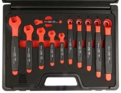 Zestaw 11-elementowych, izolowanych kluczy VDE RS Pro. Zestaw 10-elementowych kluczy VDE RS Pro wykonany jest z chromowanej stali wanadowej pokrytej warstwą winylową odporną na elektryczność, która gwarantuje bezpieczne działanie przy napięciu 1000 V. Jest to idealny zestaw kluczy dla profesjonalistów, poważnych entuzjastów gier DIY, ponieważ zawiera wszystkie najczęściej używane rozmiary. Klucze są wykończone w stylowym kolorze czarnym i czerwonym, a dostarczane w poręcznej walizce do przechowywania. Charakterystyka i zalety: Chrome Vanadium Steel zapewnia wytrzymałość i trwałość narzędzi Przypadek oznaczony kluczem o rozmiarze umożliwiającym szybką identyfikację brakujących narzędzi Narzędzia z oznaczeniami VDE zapewniające bezpieczeństwo DIN EN 60900:2004 Typowe zastosowania: Ten zestaw kluczy jest zazwyczaj używany przez zawodowych handlowców, inżynierów lub osoby pragnące wypełnić formularz DIY. Klucz maszynowy jest jednym z najważniejszych narzędzi ręcznych w każdym zestawie. Istnieje wiele sytuacji i zawodów, w których klucz jest integralną częścią wykonywania określonych zadań, obracających się wokół luzowania lub dokręcania elementów złącznych. W zastosowaniach takich jak: Produkcja mechaniczna i przemysłowa Woodworking/stolarz Przemysł motoryzacyjny Przemysł naftowy Aprobaty i certyfikacja: DIN EN 60900:2004 VDE 1000V. Odpowiedzi na często zadawane pytania: Czy banery objęte są gwarancją? Tak, banery RS PRO są objęte 3-letnią gwarancją. Co Get pojawi się w zestawie? Zestaw zawiera rozmiary: Izolowane planisty VDE otwarte: 7,8,10,12,14,17 mm Izolowane planisty VDE Ring: 7,8,10,12,14 mm