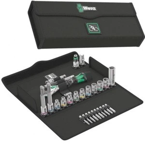 Zestaw narzędzi rowerowych składający się z 27 elementów to doskonałe akcesorium przeznaczone do stosowania w różnych częściach roweru, które wymagają regulacji, montażu lub demontażu. Kompaktowy zestaw wielu narzędzi składający się z grzechotki, kluczy nasadowych, przedłużek, adapterów oraz bitów zajmujący niewiele miejsca w solidnym tekstylnym pudełku.