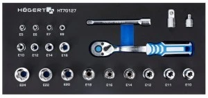- HT1A884 (nasadki 1/4”: E5, E6, E7, E8; 3/8”: E10, E12, E14, E16; adapter HT1A771), adapter HT1A772, przedłużka 3/8” HT1A714, grzechotka 3/8” HT1R328, HT1A880 (nasadki 1/2”, E10, E11, E12, E14, E16, E18, E20, E22, E24);