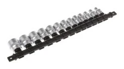 8, 9, 10, 11, 12,13, 14, 15, 16, 17, 18, 19, 21 mm. 3/8 in. 13-elementowy zestaw gniazd metrycznych. Wysokiej jakości zestaw 12-punktowego gniazda metrycznego o kwadratowym kwadracie 13-elementowym./AF. Gniazda wykonane z chromowanej stali wanadowej oraz hartowane i hartowane Dla ułatwienia identyfikacji, jest wykonane z podwójną taśmą radełkowania Każdy zestaw dostarczany na listwie mocującej szynę gniazd, który może być montowany na ścianie lub używany w pojemniku na akcesoria w szafkach na rolki Gniazda posiadają rowek przytrzymujący kulkę po każdej stronie kwadratowej końcówki, który zapewnia dobre dopasowanie do akcesoriów