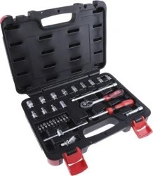 ;b>Zestaw nasadek 1/4" RS Pro 29 Sztuk ;/b>. Profesjonalne gniazdo Chrome Vanadium Steel 1/4" z kwadratowym gniazdem i zestawem bitów dostarczane w niewielkiej, łatwej do przechowania obudowie. Ten zestaw jest wyposażony w gniazda 12 x 1/4 cala o wymiarach od 4 mm do 13 mm i 10 bitów, w tym gniazdo Slotte, Phillips i Pozidriv. Zestaw ten może być używany do większości zadań, w szczególności do budowania lub naprawiania różnych przedmiotów, w tym napraw samochodowych. Gniazda są zazwyczaj kupowane jako zestaw tylko jednego narzędzia obrotowego, a zestaw gniazd jest potrzebny do wykonania wielu różnych kluczy. Zestawy gniazd zajmują mniej miejsca niż zestaw kluczy i są używane w różnych miejscach, takich jak garaże, w domu, inżynieria czy prace metalowe. Wybierając zestaw nasadek do kupienia zawsze masz pomysł, jakiego typu grzechotkę lub klucz należy użyć, ponieważ użycie niewłaściwego rozmiaru spowoduje uszkodzenie mocowania, co utrudnia jego ruch. ;b>Charakterystyka i zalety ;/b>. Chromowane wanadium zapewniające doskonałą wytrzymałość i odporność na korozję Uchwyt z zapadką o miękkim kształcie zapewnia mniejsze zmęczenie i większą przyczepność Listwy przedłużające do trudno dostępnych miejsc Etykietowanie z odpowiednimi elementami umożliwia szybką i łatwą identyfikację Silny zatrzask do bezpiecznego zamykania Sprawny futerał zapewniający łatwe i wygodne przechowywanie i ochronę. Typowe zastosowania. Ten zestaw gniazd jest zwykle używany przez profesjonalnych handlowców, mechaników lub osoby pragnące wypełnić formularz DIY. Zestawy gniazd mogą być używane w wielu sytuacjach i zawodach, w których gniazdo jest integralne do wykonywania określonych zadań, obracających się wokół luzowania lub dokręcania, takich jak:-. Konserwacja. Budowa. Natychmiastki. Mechaniczne / garaże samochodowe. ;b>Co Get ;/b>. 12-częściowe gniazda 1/4in: 4, 4,5, 5, 5,5, 6,7, 8, 9, 10, 11, 12, 13 mm10-elementowe gniazda 1/4in Bit- Z rowkiem: 3, 4, 5,5, 7 mm- Phillips: Faza 1, PH2, PH3- Pozidriv: PZ1, PZ2, PZ3Rączka wewnętrzna 1 x 1/4cala2 x 1/4cala, listwa przedłużająca 50 mm i 150 mm1x 1/4in dźwignia RatchetaPrzesuwana głowica T-Bar 1x 1/4inZłącze 1 x 1/4cala1 x złącze uniwersalne. ;b>Dlaczego warto wybrać ten zestaw? ;/b>. Zestaw ten, wyposażony w różne bity sterujące i gniazda metryczne, jest kompaktowym i niezawodnym zestawem narzędzi przeznaczonym zarówno do użytku profesjonalnego, jak i typu DIY. Używając klucza zapadkowego i wkrętaka, można wygodnie pracować zarówno podczas dokręcania, luzowania, jak i regulacji wszystkiego w domu lub w miejscu pracy. ;b>RS Pro ;/b>. RS Pro to nasza własna oferta marek i oferuje szeroki wybór wysokiej jakości, atrakcyjnych produktów, oferujących większy wybór. Każdy produkt RS Pro, zaufany inżynierom na całym świecie, został rygorystycznie przetestowany pod kątem wysokich standardów branżowych. Jeśli jesteśmy pewni wyjątkowej jakości RS Pro Seal of Approval, to zawsze możesz mieć pewność, że jest on także pewny siebie.