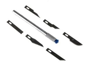 Precyzyjny zestaw noży 7-elementowych. Składa się z jednego lekkiego uchwytu z aluminium o długości 115 mm i sześciu różnych ostrzy Różne ostrza, kwadratowe, płaskie, zaokrąglone i ukośne, wszystkie wymienne Kompletny zestaw owinięty folią