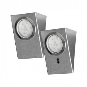 Zestaw dwóch narożnych opraw podszafkowych, wyposażonych w nowoczesne diody LED typu SMD, które w porównaniu do tradycyjnych źródeł światła pozwalają na znaczną oszczędność energii. Idealnie sprawdzą się jako dodatkowe oświetlenie montowane pod szafkami kuchennymi lub jako oświetlenie punktowe do doświetlenia blatów podczas pracy. Posiadają wbudowany, zbliżeniowy wyłącznik ON/OFF działający już na sam ruch ręki. Takie rozwiązanie jest szczególnie praktyczne w kuchni, gdzie często mamy zajęte lub brudne ręce. Prezentowane oprawki sprawdzą się też jako podświetlenie mebli, gablot, półek oraz witryn w salonie czy sypialni. Oprawki w prezentowanym zestawie działają każda z mocą 2,5W i emitują światło w ilości 180 lm. Świecą naturalną białą barwą o temperaturze 4000K. Materiał: stal nierdzewna inox.