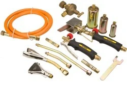 Zestaw palników gazowych 28kW, 7 palników: 2 punktowe, 1 otaczający, 1 płaski, 3 warsztatowe, wąż 3 m, temperatura pracy 1850°C, reduktor ciśnienia gazu, lutownica gazowa, maksymalne zużycie gazu 2000 g/h, masa 5.6 kg