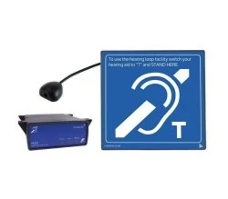 Antena pętli indukcyjnej została zintegrowana ze znakiem informacyjnym, który można zamocować na ladzie, blacie lub powierzchni szklanej. Dyskretna konstrukcja umożliwia elastyczne rozmieszczenie systemu bez ingerencji w przestrzeń roboczą, jednocześnie zapewniając widoczne oznaczenie dostępności wsparcia słuchowego.