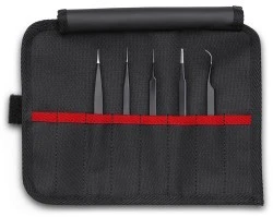 - Pięć wysokiej jakości zestawów pęset: pęsety precyzyjne, pęsety uniwersalne, SMD-, ESD, z tworzywa sztucznego i izolowane