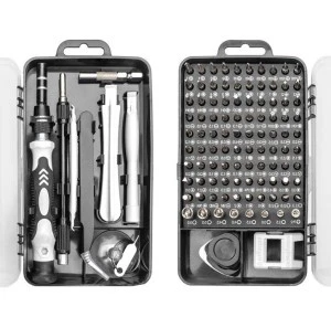 Solidna wykonana walizka zawiera aż 115 elementów, w których skład wchodzi 98 bitów do wkrętarki oraz inne precyzyjne przyrządy, takie jak pęseta i różnego rodzaju uchwyty.