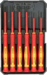 Zestaw precyzyjnych wkrętaków izolowanych VDE z wytrzymałymi grotami wykonanymi ze stali S2.