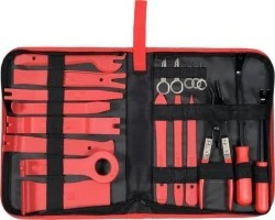 Profesjonalny zestaw ściągaczy do demontażu tapicerki, spinek i listew samochodowych. Przydaje się również przy wyjmowaniu radia samochodowego, licznika, sprzętu elektronicznego. Elementy wykonane z wytrzymałego tworzywa, dzięki czemu nie wyszczerbisz rantów tapicerki podczas jej podważania. Zestaw polecany do prac w serwisach samochodowych, tapicerskich, blacharskich i lakierniczych.